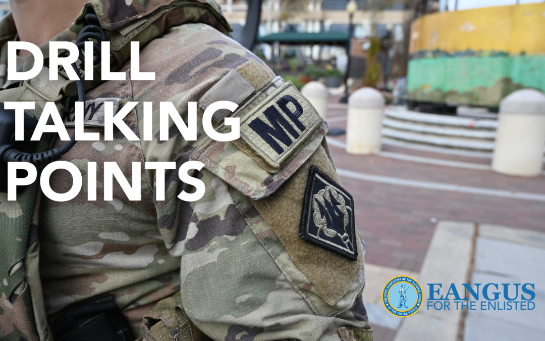 EANGUS supports No Tax on Drill Pay legislation introduced by Representative Andy Barr (R-KY) which would eliminate federal income taxes on Inactive Duty Training (IDT) pay earned during drill weekends. This would reduce the financial burden on Guard and Reserve members who already incur out-of-pocket costs to serve.